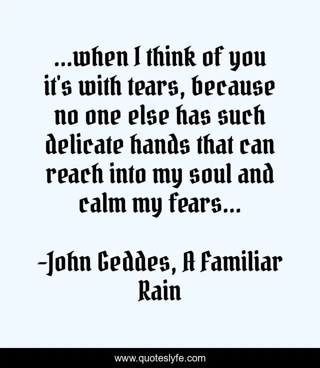 This page presents the quote "...when I think of you it's with tears, because no one else has such delicate hands that can reach into my soul and calm my fears...". Author of this quote is John Geddes, A Familiar Rain. This quote is about love, soulmates, fears, soul, tears, calm, affection,.