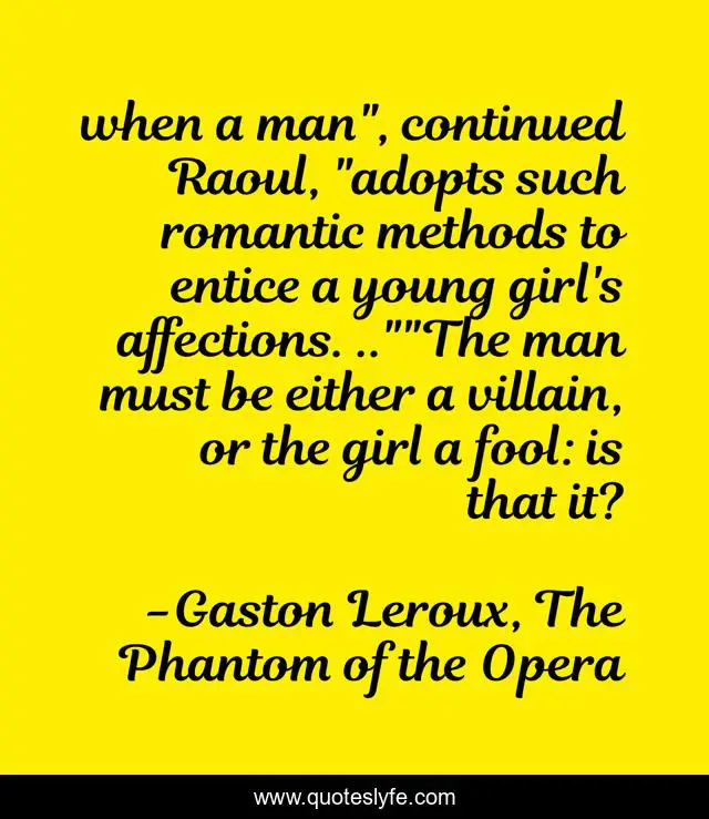 This page presents the quote "when a man", continued Raoul, "adopts such romantic methods to entice a young girl's affections. ..""The man must be either a villain, or the girl a fool: is that it?". Author of this quote is Gaston Leroux, The Phantom of the Opera. This quote is about love, quote, break-ups, truth, deception, affection, phantom-of-the-opera,.
