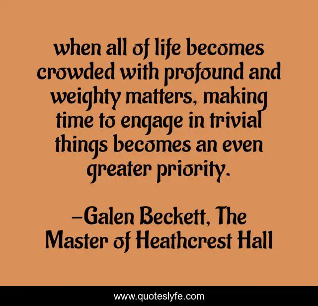 This page presents the quote "when all of life becomes crowded with profound and weighty matters, making time to engage in trivial things becomes an even greater priority.". Author of this quote is Galen Beckett, The Master of Heathcrest Hall. .