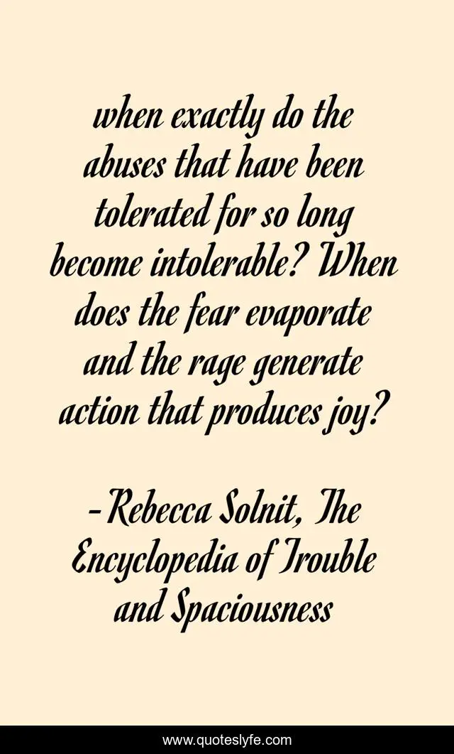 This page presents the quote "when exactly do the abuses that have been tolerated for so long become intolerable? When does the fear evaporate and the rage generate action that produces joy?". Author of this quote is Rebecca Solnit, The Encyclopedia of Trouble and Spaciousness. This quote is about joy, fear, rage,.