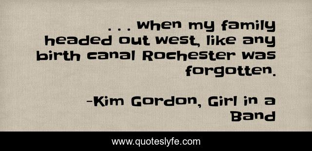 This page presents the quote ". . . when my family headed out west, like any birth canal Rochester was forgotten.". Author of this quote is Kim Gordon, Girl in a Band. This quote is about punk-rock, westcoast, feminism, roots,.