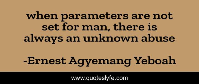 This page presents the quote "when parameters are not set for man, there is always an unknown abuse". Author of this quote is Ernest Agyemang Yeboah. This quote is about abuse, purpose, authority,.