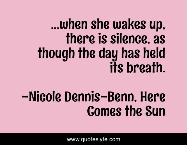 This page presents the quote "...when she wakes up, there is silence, as though the day has held its breath.". Author of this quote is Nicole Dennis-Benn, Here Comes the Sun. This quote is about sky, morning,.