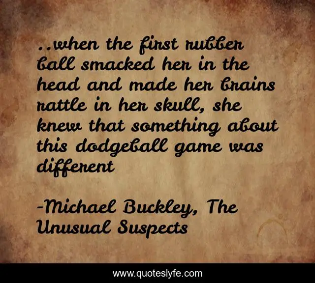 This page presents the quote "..when the first rubber ball smacked her in the head and made her brains rattle in her skull, she knew that something about this dodgeball game was different". Author of this quote is Michael Buckley, The Unusual Suspects. This quote is about funny, comedy, michael-buckley, dodgeball,.