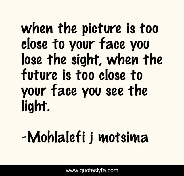 This page presents the quote "when the picture is too close to your face you lose the sight, when the future is too close to your face you see the light.". Author of this quote is Mohlalefi j motsima. This quote is about closure, picture, future, sight, optometric, hope,.