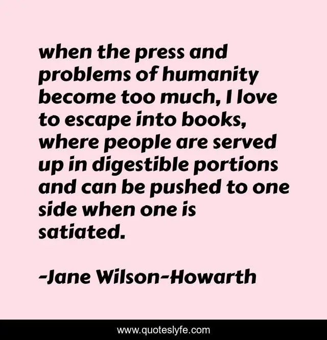 This page presents the quote "when the press and problems of humanity become too much, I love to escape into books, where people are served up in digestible portions and can be pushed to one side when one is satiated.". Author of this quote is Jane Wilson-Howarth. This quote is about libraries, enthusiasm, books, humanity, inspirational,.