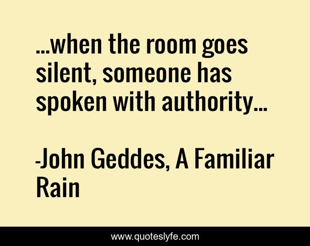 This page presents the quote "...when the room goes silent, someone has spoken with authority...". Author of this quote is John Geddes, A Familiar Rain. This quote is about speaker, authority,.