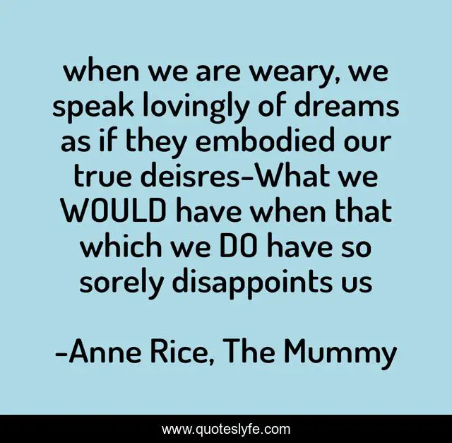 This page presents the quote "when we are weary, we speak lovingly of dreams as if they embodied our true deisres-What we WOULD have when that which we DO have so sorely disappoints us". Author of this quote is Anne Rice, The Mummy. .