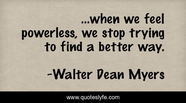 This page presents the quote "...when we feel powerless, we stop trying to find a better way.". Author of this quote is Walter Dean Myers. This quote is about powerlessness, empowerment, hope,.