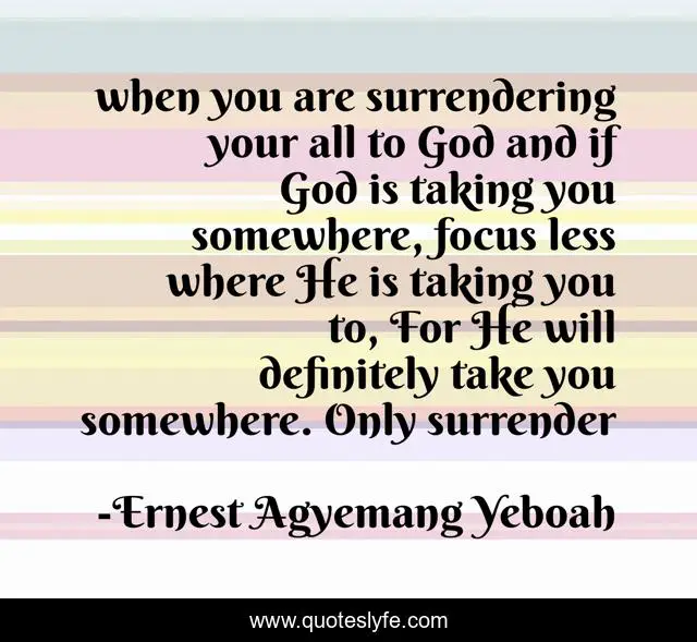 This page presents the quote "when you are surrendering your all to God and if God is taking you somewhere, focus less where He is taking you to, For He will definitely take you somewhere. Only surrender". Author of this quote is Ernest Agyemang Yeboah. This quote is about the-ways-of-god, the-will-of-god, power-of-god, living-for-christ, waiting, a-step-to-god, deciding-for-christ, surrendering-to-god, purposes-of-god,.