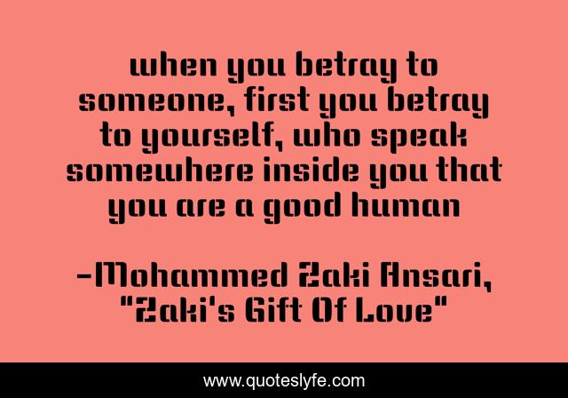 This page presents the quote "when you betray to someone, first you betray to yourself, who speak somewhere inside you that you are a good human". Author of this quote is Mohammed Zaki Ansari, "Zaki's Gift Of Love". This quote is about betrayal, love, affection, hurt,.