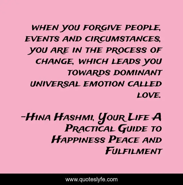 This page presents the quote "when you forgive people, events and circumstances, you are in the process of change, which leads you towards dominant universal emotion called love.". Author of this quote is Hina Hashmi, Your Life A Practical Guide to Happiness Peace and Fulfilment. This quote is about forgiveness, love, emotions, affection, universe,.