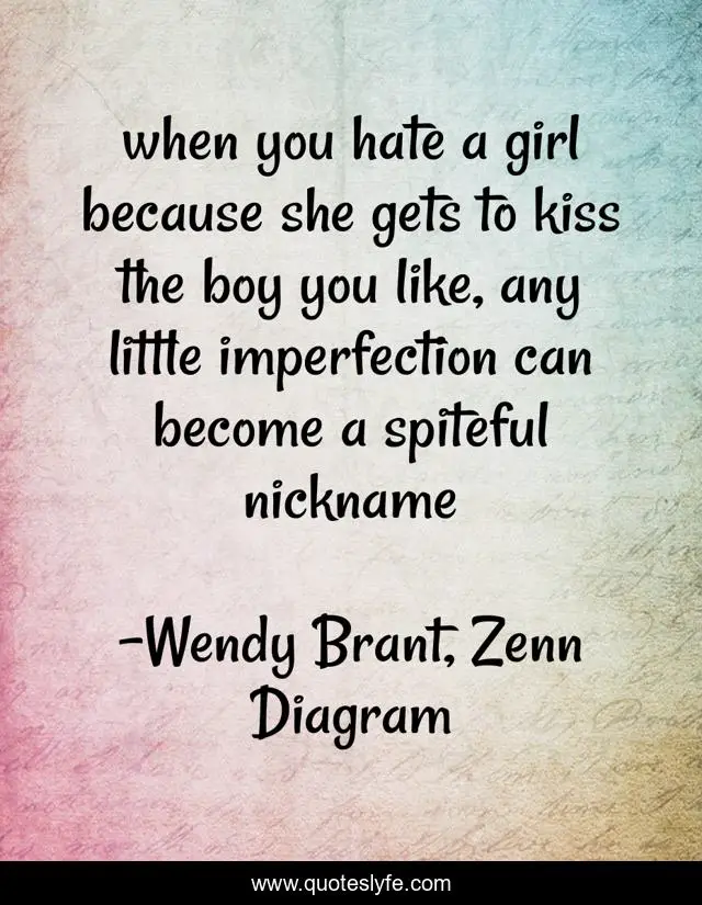 This page presents the quote "when you hate a girl because she gets to kiss the boy you like, any little imperfection can become a spiteful nickname". Author of this quote is Wendy Brant, Zenn Diagram. This quote is about girls, spite,.