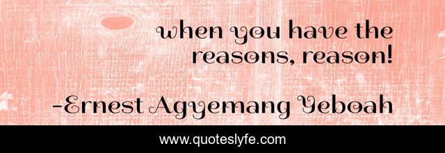 This page presents the quote "when you have the reasons, reason!". Author of this quote is Ernest Agyemang Yeboah. This quote is about daring-greatly, love, thought-provoking, thoughts-on-life, feelings, thought, patience, emotional-intelligence, resoning,.