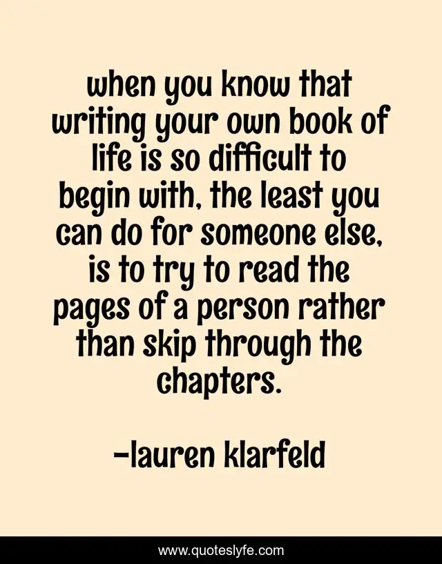 This page presents the quote "when you know that writing your own book of life is so difficult to begin with, the least you can do for someone else, is to try to read the pages of a person rather than skip through the chapters.". Author of this quote is lauren klarfeld. This quote is about true-love, life, patience, patience-and-love, reading, book-of-life,.
