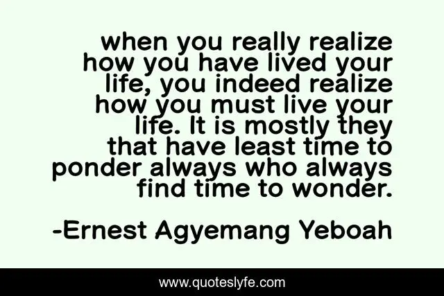 This page presents the quote "when you really realize how you have lived your life, you indeed realize how you must live your life. It is mostly they that have least time to ponder always who always find time to wonder.". Author of this quote is Ernest Agyemang Yeboah. This quote is about ponder, learning-from-mistakes, lost-opprtunities, learning-life-lessons, regrets, mistakes, learning-from-our-struggles, learning-from-adversity, reasons-to-be-happy,.