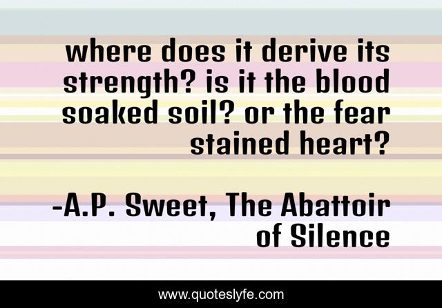This page presents the quote "where does it derive its strength? is it the blood soaked soil? or the fear stained heart?". Author of this quote is A.P. Sweet, The Abattoir of Silence. This quote is about heart, fear, strength, blood,.