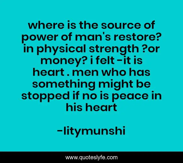 This page presents the quote "where is the source of power of man's restore? in physical strength ?or money? i felt -it is heart . men who has something might be stopped if no is peace in his heart". Author of this quote is litymunshi. This quote is about life-philosophy, love, affection,.