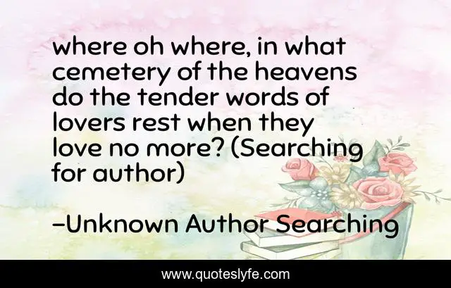 This page presents the quote "where oh where, in what cemetery of the heavens do the tender words of lovers rest when they love no more? (Searching for author)". Author of this quote is Unknown Author Searching. This quote is about lovers, cemetery-of-the-heavens, lost-love,.