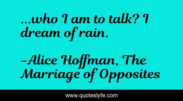 This page presents the quote "...who I am to talk? I dream of rain.". Author of this quote is Alice Hoffman, The Marriage of Opposites. This quote is about dreams, rain,.