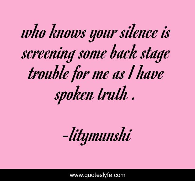 This page presents the quote "who knows your silence is screening some back stage trouble for me as I have spoken truth .". Author of this quote is litymunshi. This quote is about life, love, danger-stop, affection, care, silence, trap,.