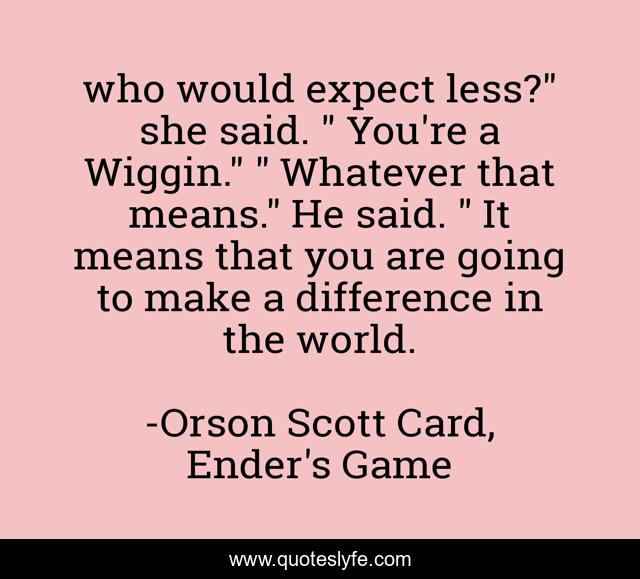 This page presents the quote "who would expect less?" she said. " You're a Wiggin." " Whatever that means." He said. " It means that you are going to make a difference in the world.". Author of this quote is Orson Scott Card, Ender's Game. This quote is about world, life, purpuse, meaning, change,.