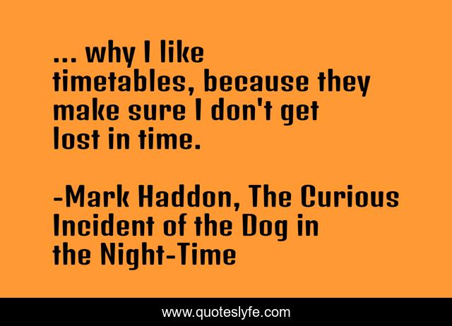 This page presents the quote "... why I like timetables, because they make sure I don't get lost in time.". Author of this quote is Mark Haddon, The Curious Incident of the Dog in the Night-Time. This quote is about structure, time,.