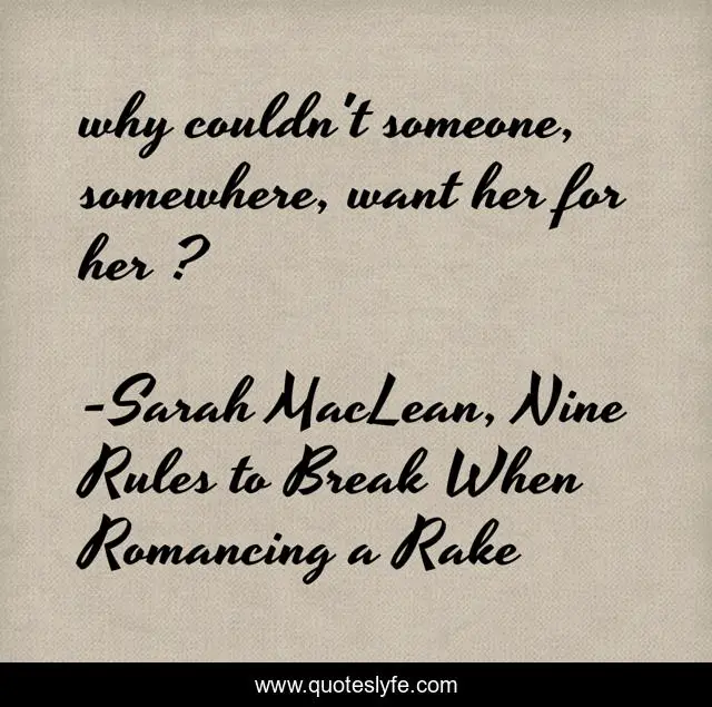 "Sarah MacLean, Nine Rules to Break When Romancing a Rake Quotes." Quoteslyfe.com, 2025. Sat. 06 Dec. 2025. <https://www.quoteslyfe.com/quote/why-couldn-t-someone-somewhere-want-her-240206>.