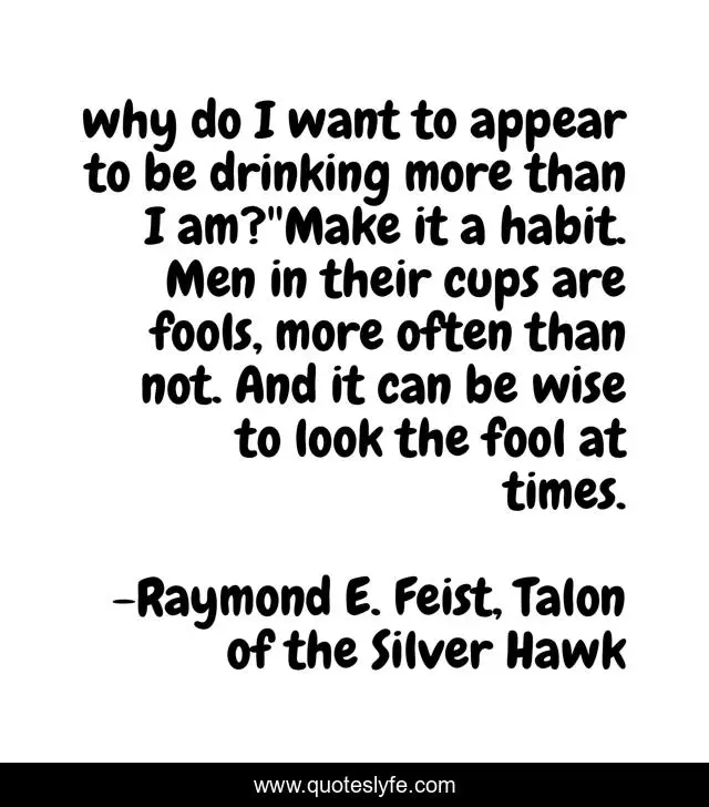 This page presents the quote "why do I want to appear to be drinking more than I am?''Make it a habit. Men in their cups are fools, more often than not. And it can be wise to look the fool at times.". Author of this quote is Raymond E. Feist, Talon of the Silver Hawk. This quote is about drinking, subterfuge, wisdom,.