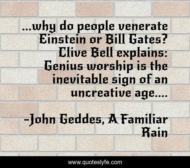 This page presents the quote "...why do people venerate Einstein or Bill Gates? Clive Bell explains: Genius worship is the inevitable sign of an uncreative age....". Author of this quote is John Geddes, A Familiar Rain. This quote is about veneration, bill-gates, clive-bell, genius, era, einstein, uncreative, worship,.