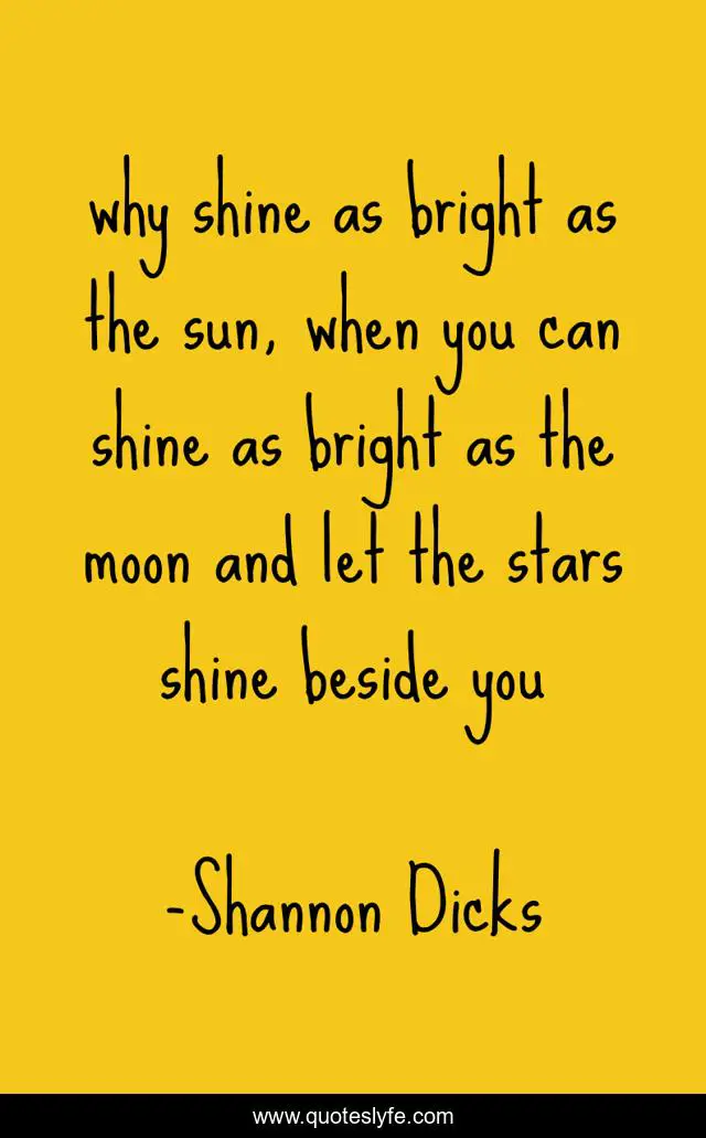 This page presents the quote "why shine as bright as the sun, when you can shine as bright as the moon and let the stars shine beside you". Author of this quote is Shannon Dicks. This quote is about life, love, friends, spiritual, hope, inspirational, enthusiasm, meaningful, affection,.