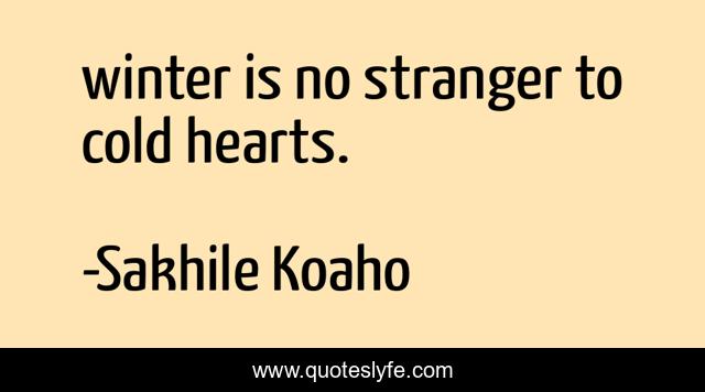 This page presents the quote "winter is no stranger to cold hearts.". Author of this quote is Sakhile Koaho. This quote is about broken-faith, lonely, defeated, hurt,.