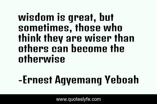 This page presents the quote "wisdom is great, but sometimes, those who think they are wiser than others can become the otherwise". Author of this quote is Ernest Agyemang Yeboah. This quote is about sometimes, wisdom, knowing-when-the-time-is-right, knowing-what-is-worth, inspirational, enthusiasm, otherwise, false-authority, knowing-oneself,.