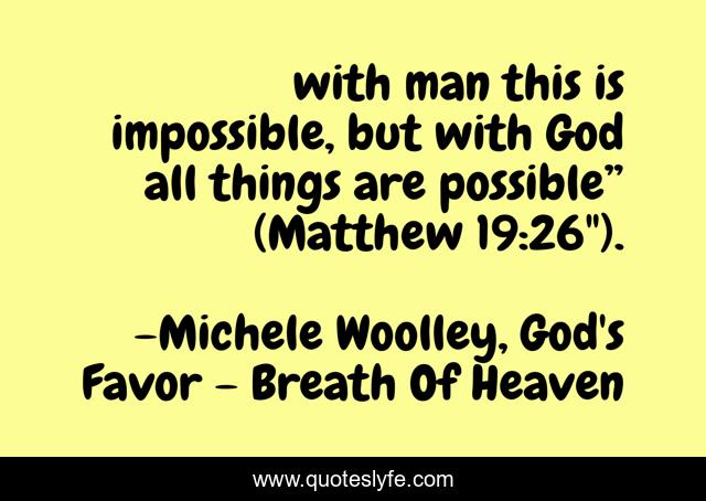 This page presents the quote "with man this is impossible, but with God all things are possible” (Matthew 19:26").". Author of this quote is Michele Woolley, God's Favor - Breath Of Heaven. This quote is about faith, love, favor, hope, self-help, christian-community, affection, self-esteem,.