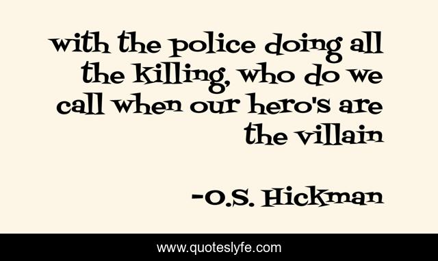 This page presents the quote "with the police doing all the killing, who do we call when our hero's are the villain". Author of this quote is O.S. Hickman. This quote is about different, assination, legalism, brutality, divergent, punishing, discrimination, image, racism,.