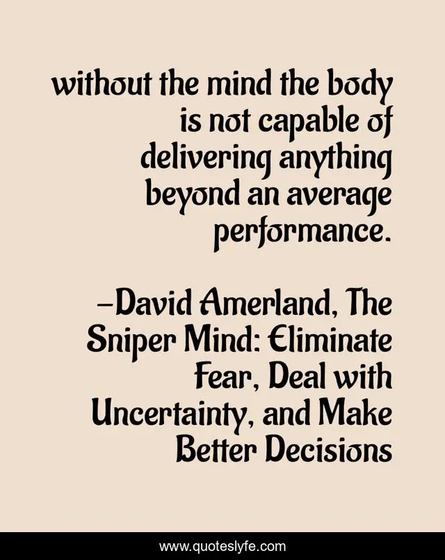 "David Amerland, The Sniper Mind: Eliminate Fear, Deal with Uncertainty, and Make Better Decisions Quotes." Quoteslyfe.com, 2025. Mon. 08 Dec. 2025. <https://www.quoteslyfe.com/quote/without-the-mind-the-body-is-not-128296>.