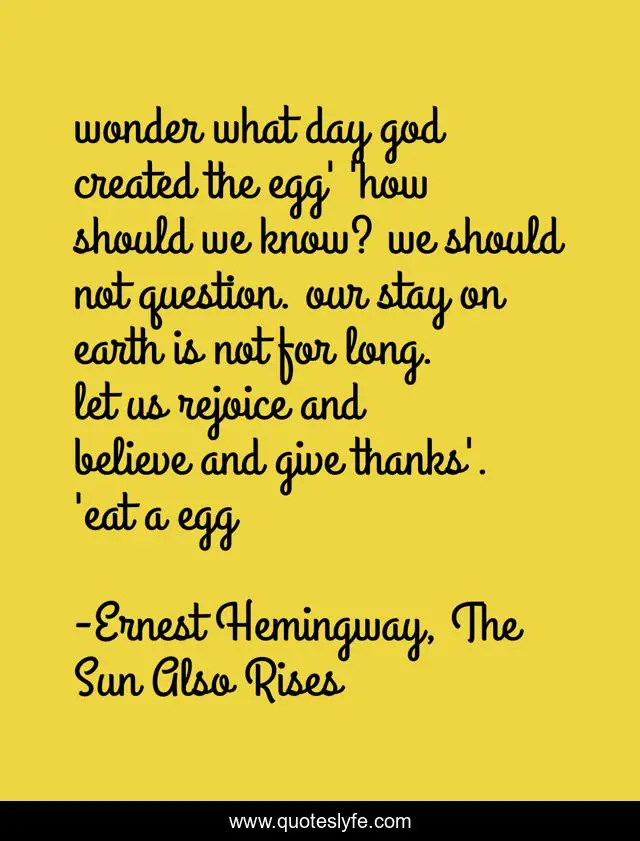 This page presents the quote "wonder what day god created the egg' 'how should we know? we should not question. our stay on earth is not for long. let us rejoice and believe and give thanks'. 'eat a egg". Author of this quote is Ernest Hemingway, The Sun Also Rises. This quote is about god, hemingway, egg,.