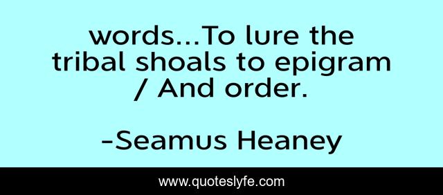 This page presents the quote "words...To lure the tribal shoals to epigram / And order.". Author of this quote is Seamus Heaney. This quote is about tribes, lures, order, words, poetry,.