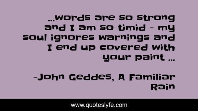 This page presents the quote "...words are so strong and I am so timid - my soul ignores warnings and I end up covered with your paint ...". Author of this quote is John Geddes, A Familiar Rain. This quote is about love, warnings, shy, soul, poetry, disappointment, words, timid, affection,.