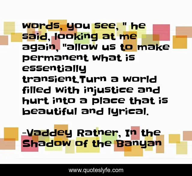 This page presents the quote "words, you see, " he said, looking at me again, "allow us to make permanent what is essentially transient.Turn a world filled with injustice and hurt into a place that is beautiful and lyrical.". Author of this quote is Vaddey Ratner, In the Shadow of the Banyan. This quote is about storytelling, words,.