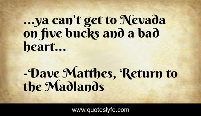 This page presents the quote "...ya can't get to Nevada on five bucks and a bad heart...". Author of this quote is Dave Matthes, Return to the Madlands. This quote is about crazy, cynical, daydreaming, coming-of-age, calm, bottle, ambition, childhood, bravery,.
