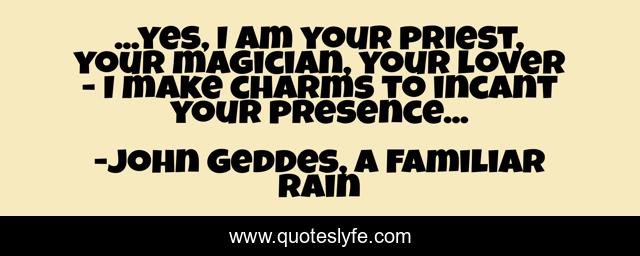 This page presents the quote "...yes, I am your priest, your magician, your lover - I make charms to incant your presence...". Author of this quote is John Geddes, A Familiar Rain. This quote is about incant, love, poetry, summon, priest, lover, magician, affection,.