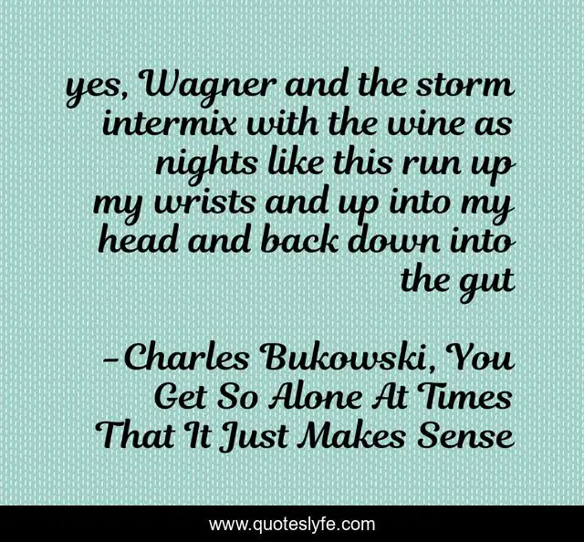 This page presents the quote "yes, Wagner and the storm intermix with the wine as nights like this run up my wrists and up into my head and back down into the gut". Author of this quote is Charles Bukowski, You Get So Alone At Times That It Just Makes Sense. .