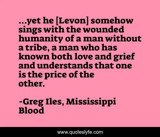 This page presents the quote "...yet he [Levon] somehow sings with the wounded humanity of a man without a tribe, a man who has known both love and grief and understands that one is the price of the other.". Author of this quote is Greg Iles, Mississippi Blood. .