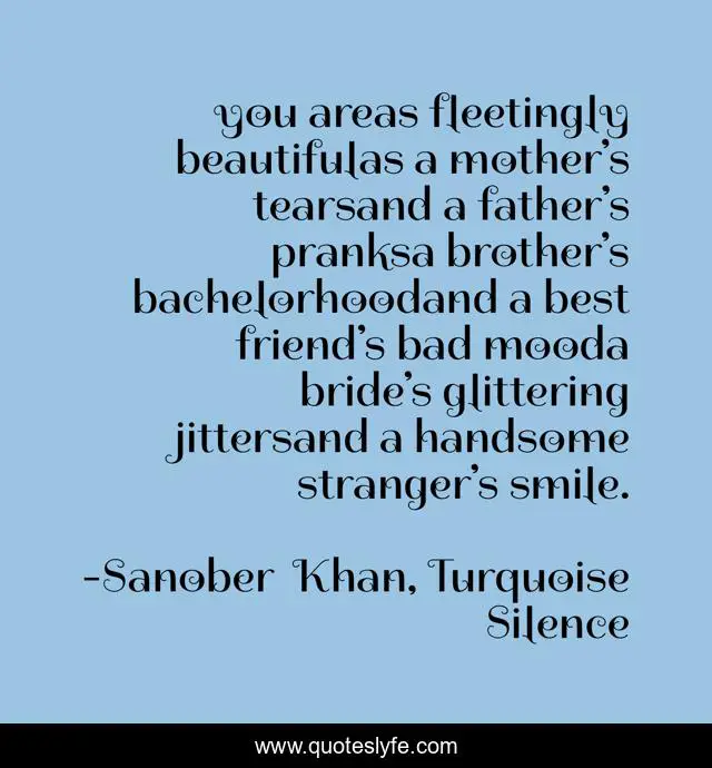 This page presents the quote "you areas fleetingly beautifulas a mother’s tearsand a father’s pranksa brother’s bachelorhoodand a best friend’s bad mooda bride’s glittering jittersand a handsome stranger’s smile.". Author of this quote is Sanober Khan, Turquoise Silence. This quote is about bachelorhood, beautiful, fleeting, moments, father, poetry, fleeting-life, strangers, bride,.