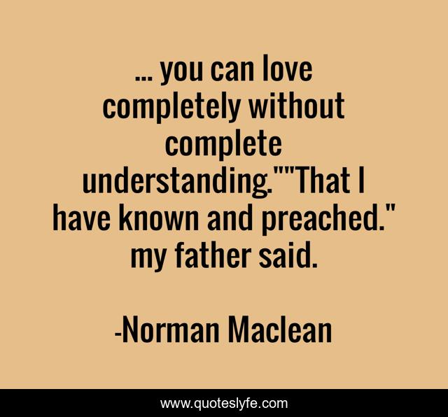 This page presents the quote "... you can love completely without complete understanding.""That I have known and preached." my father said.". Author of this quote is Norman Maclean. This quote is about love, grace, affection,.