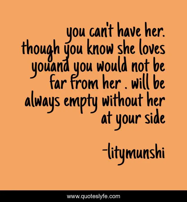 This page presents the quote "you can't have her. though you know she loves youand you would not be far from her . will be always empty without her at your side". Author of this quote is litymunshi. This quote is about life, love, jelousy, time, happy, hate, affection, care,.