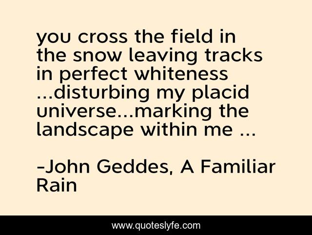 This page presents the quote "you cross the field in the snow leaving tracks in perfect whiteness ...disturbing my placid universe...marking the landscape within me ...". Author of this quote is John Geddes, A Familiar Rain. This quote is about universe, poetry, snow, placid, peaceful, disturbing, world, whiteness, landscape,.