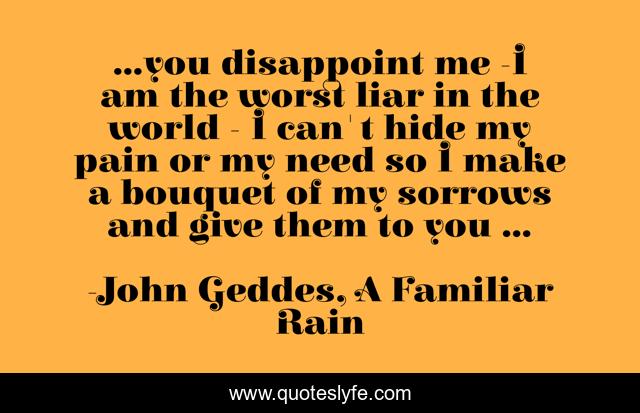 This page presents the quote "...you disappoint me -I am the worst liar in the world - I can't hide my pain or my need so I make a bouquet of my sorrows and give them to you ...". Author of this quote is John Geddes, A Familiar Rain. This quote is about liar, poetry, sorrows, lies, disappointment, love, pain, affection,.