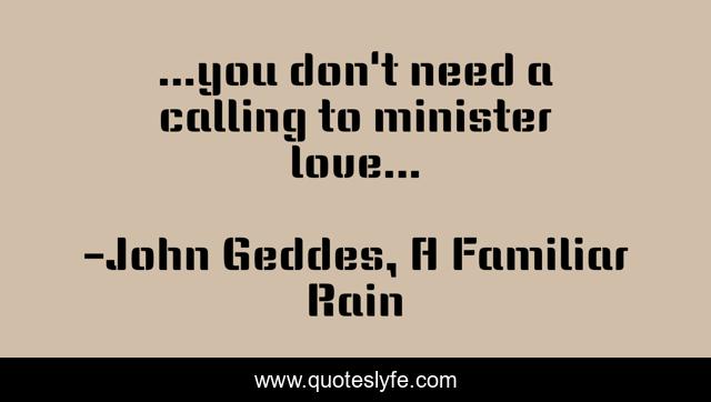 This page presents the quote "...you don't need a calling to minister love...". Author of this quote is John Geddes, A Familiar Rain. This quote is about calling, love, minister, affection, wisdom,.
